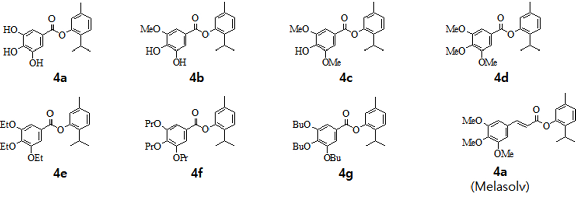 로도덴드롤은 구조적으로 보면 타이로신 유사 화합물이며 동시에 페놀 화합물입니다. 신규 미백제를 개발하려는 목적으로 티몰(Thymol)과 다양한 애씨드를 반응시켜 에스테르 화합물을 합성하고 미백 효능과 세포 독성을 확인하였습니다. 페놀 그룹을 가지고 있는 화합물은 미백 효과와 세포 독성을 동시에 나타냈습니다. 충분히 예상할 수 있는 결과입니다. 그런데, 페놀그룹을 가지고 있지 않은 화합물의 경우도 우수한 미백 효과를 나타내는 것을 발견하였습니다. . 더욱 특이한 건 미백 효과를 나타내면서도 세포 독성은 보이지 않는다는 것입니다. 페놀 그룹을 가지고 있지 않기 때문에 티로시나제 억제 효과도 라디칼 소거능도 보이지 않았습니다. 미백제는 두가지로 구분할 수 있습니다 페놀성 미백제와 비페놀성 미백제입니다.